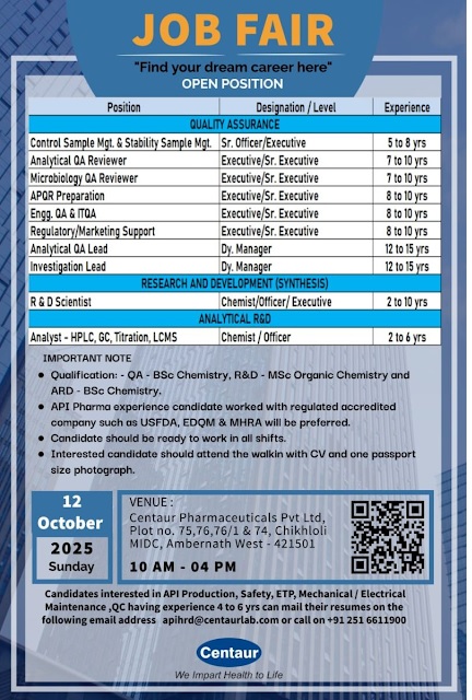 Centaur Pharmaceuticals -Walk In Interview On 12th Oct 2025
