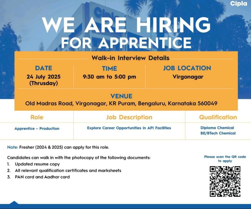 Cipla-Walk in for Freshers Production on 24th July 2025 Cipla-Walk in for Freshers Production on 24th July 2025 WE ARE HIRING FOR APPRENTICE DATE : 24 July 2025 (Thursday) TIME : 9:30 am to 5:00 pm JOB LOCATION : Virgonagar VENUE :Old Madras Road, Virgonagar, KR Puram, Bengaluru, Karnataka 560049 Role : Apprentice – Production Job description: Explore Career Opportunities in API Facilities Qualification: Diploma Chemical BE/BTech Chemical Note: Freshers (2024 & 2025) can apply for this role. Candidates can walk in with the photocopy of the following documents: 1. Updated resume copy 2. All relevant qualification certificates and marksheets 3. PAN card and Aadhar card Post Views: 407 Job Category: Pharma Job Type: Full Time Job Location: Virgonagar Apply for this position Full Name *Email *Phone *Cover Letter *Upload CV/Resume *Allowed Type(s): .pdf, .doc, .docxBy using this form you agree with the storage and handling of your data by this website. *