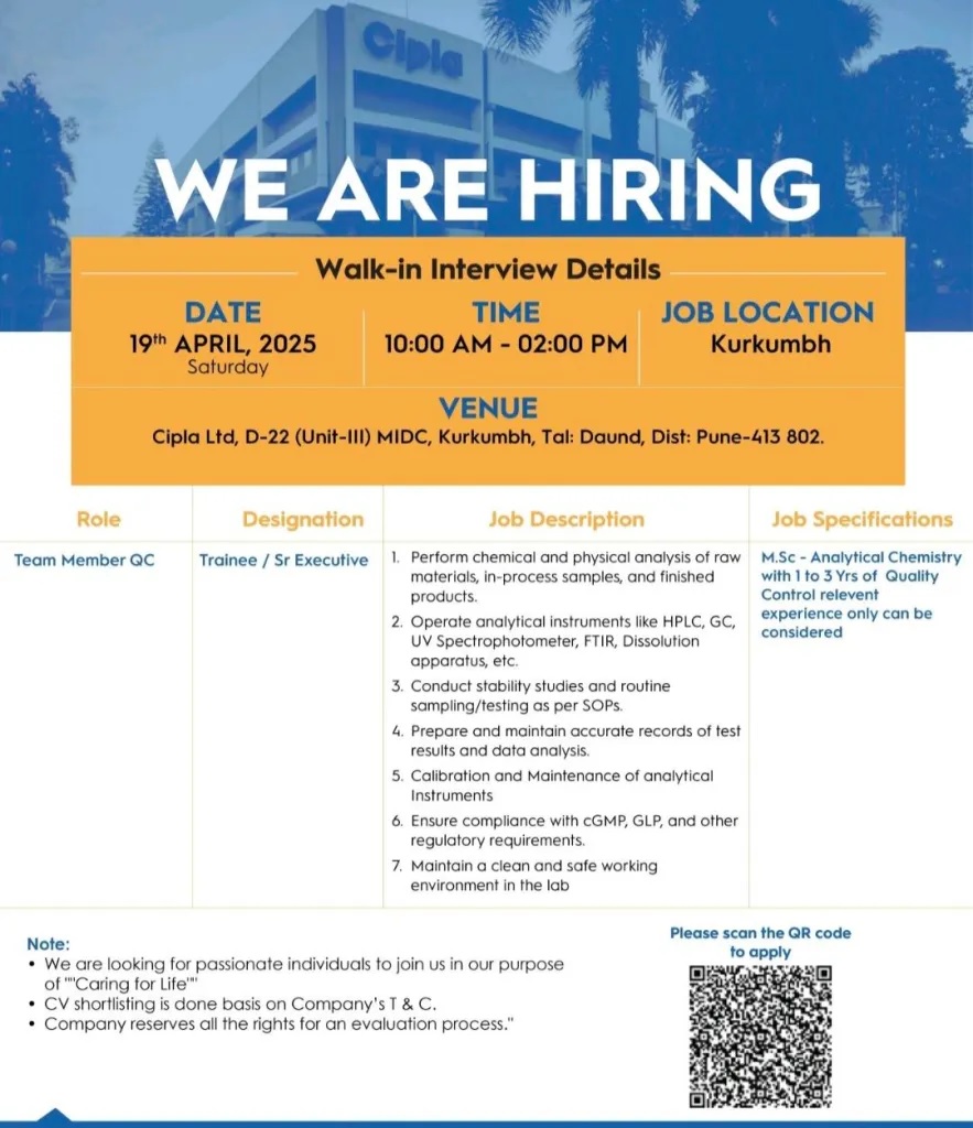 Cipla- Walk in Interview for QC Team Member on 19th April 2025