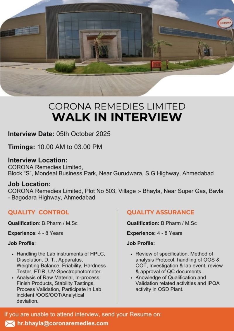 Corona Remedies Walk in For Quality Control & Quality Assurance on October 5, 2025 Corona Remedies Walk in For Quality Control & Quality Assurance on October 5, 2025 Post Views: 174 Job Category: Pharma Job Type: Full Time Job Location: Ahmadabad Apply for this position Full Name *Email *Phone *Cover Letter *Upload CV/Resume *Allowed Type(s): .pdf, .doc, .docxBy using this form you agree with the storage and handling of your data by this website. *