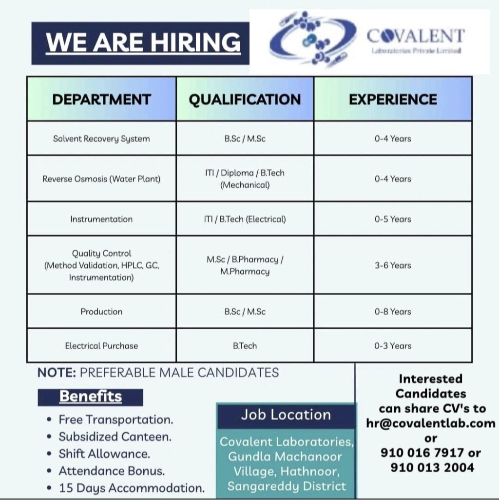 Covalent Laboratories- Hiring for QC, Production, RO Plant & More Apply Covalent Laboratories- Hiring for QC, Production, RO Plant & More Apply Post Views: 268 Job Category: Pharma Job Type: Full Time Job Location: Sangareddy Apply for this position Full Name *Email *Phone *Cover Letter *Upload CV/Resume *Allowed Type(s): .pdf, .doc, .docxBy using this form you agree with the storage and handling of your data by this website. *