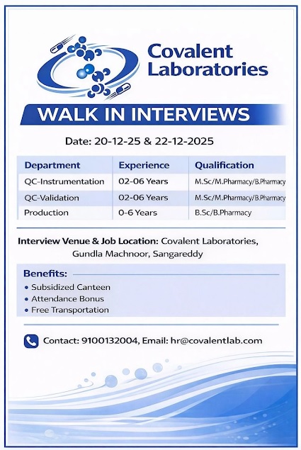 Covalent Laboratories- Walk In Interview For QC & Production Professional on 20 & 22-12-2025 Covalent Laboratories- Walk In Interview For QC & Production Professional on 20 & 22-12-2025 Post Views: 205 Job Category: Pharma Job Type: Full Time Job Location: Sangareddy Apply for this position Full Name *Email *Phone *Cover Letter *Upload CV/Resume *Allowed Type(s): .pdf, .doc, .docxBy using this form you agree with the storage and handling of your data by this website. *