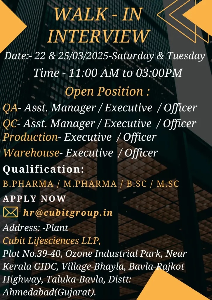 Cubit Lifesciences- Walk-In Interview for QC, QA, Production & Warehouse on 22 & 25 March 2025 Cubit Lifesciences- Walk-In Interview for QC, QA, Production & Warehouse on 22 & 25 March 2025 Post Views: 922 Job Category: Pharma Job Type: Full Time Job Location: Ahmedabad(Gujarat). Apply for this position Full Name *Email *Phone *Cover Letter *Upload CV/Resume *Allowed Type(s): .pdf, .doc, .docxBy using this form you agree with the storage and handling of your data by this website. *