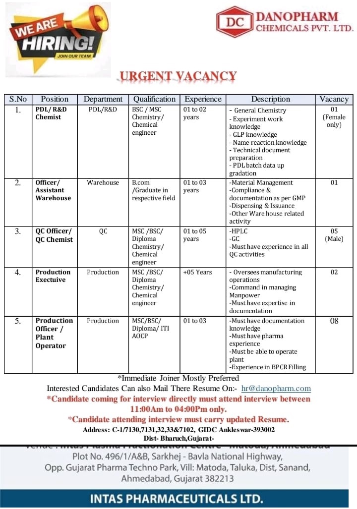 Danopharm Chemicals- Opening for multiple positions@ Ankleshwar Danopharm Chemicals- Opening for multiple positions@ Ankleshwar Post Views: 289 Job Category: Pharma Job Type: Full Time Job Location: Ankleshwar – Gujarat Apply for this position Full Name *Email *Phone *Cover Letter *Upload CV/Resume *Allowed Type(s): .pdf, .doc, .docxBy using this form you agree with the storage and handling of your data by this website. *