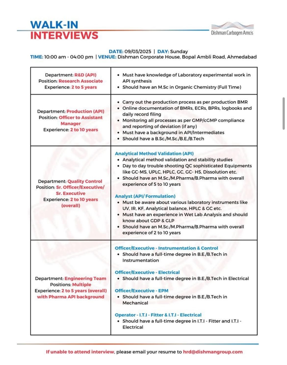 Dishman Carbogen Amics- Walk In Interviews On 9th March 2025 Dishman Carbogen Amics- Walk In Interviews On 9th March 2025 Post Views: 1,059 Job Category: Pharma Job Type: Full Time Job Location: Ahmedabad Apply for this position Full Name *Email *Phone *Cover Letter *Upload CV/Resume *Allowed Type(s): .pdf, .doc, .docxBy using this form you agree with the storage and handling of your data by this website. *