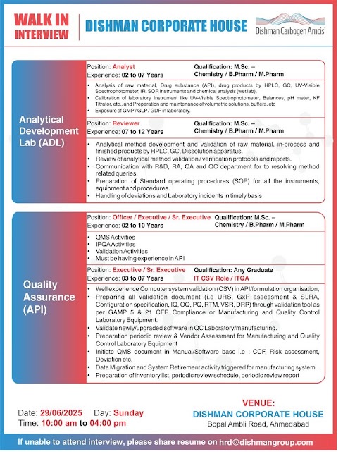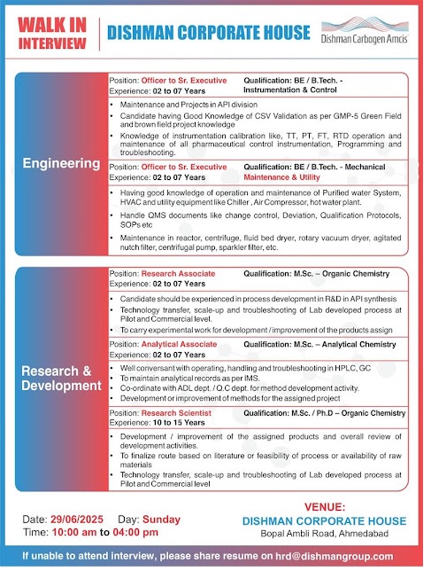 Dishman Carbogen -Walk in Interview for Engineering, ADL, Research & Development and Quality Assurance on 29th June 2025 @ Ahmedabad