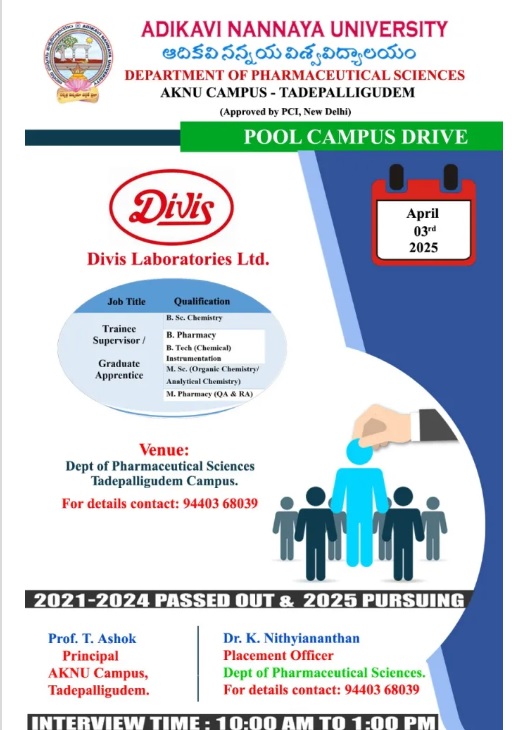 Divis Laboratories Ltd is conducting POOL CAMPUS DRIVE for Freshers – B.Sc/M.Sc / B.Pharm / M.Pharm / B.Tech on 3rd April’ 2025 @ ADIKAVI NANNAYA UNIVERSITY, TADEPALLIGUDEM, A.P