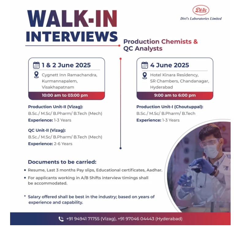 Divi’s Laboratories – Walk-In Interviews on 1st, 2nd & 4th June’ 2025 @ Visakhapatnam & Hyderabad