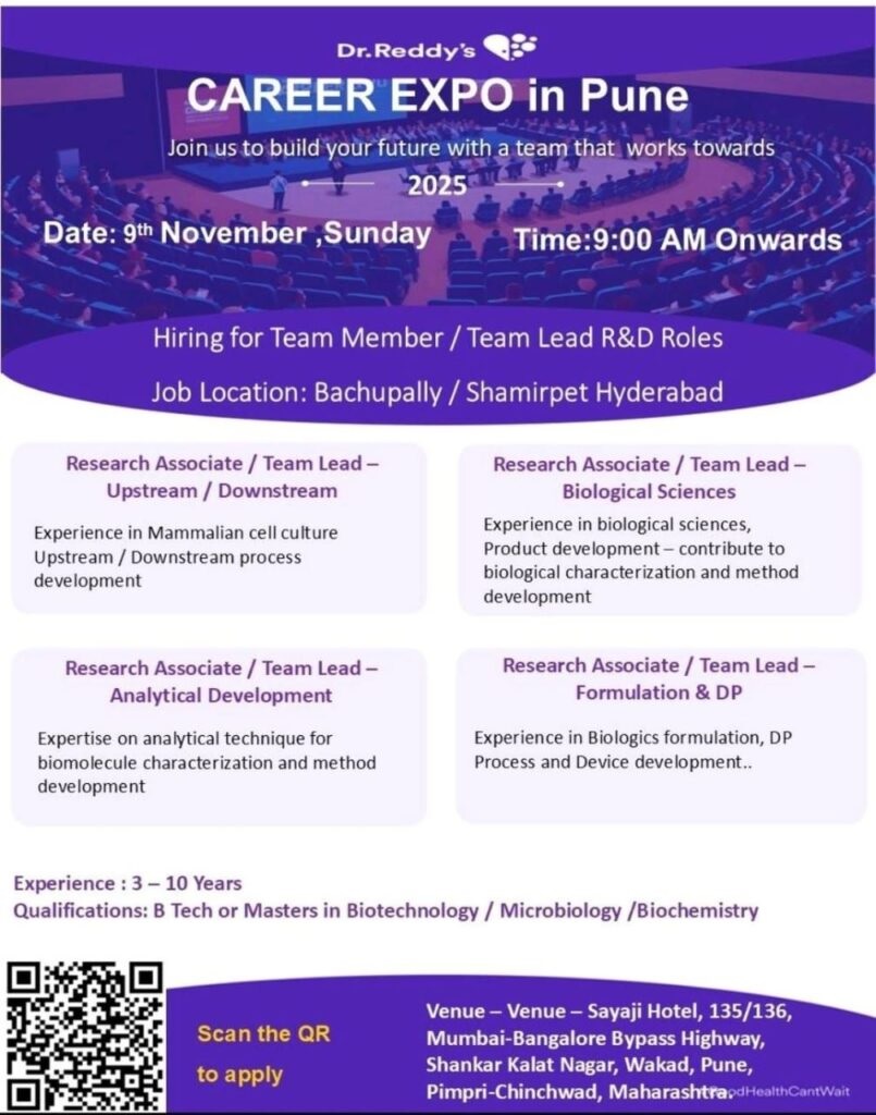 Dr. Reddy’s Career Expo- Walk-in for R&D Roles 09th November 2025@ Pune Dr. Reddy’s Career Expo- Walk-in for R&D Roles 09th November 2025@ Pune Post Views: 376 Job Category: Pharma Job Type: Full Time Job Location: Bachupally / Shamirpet Hyderabad Apply for this position Full Name *Email *Phone *Cover Letter *Upload CV/Resume *Allowed Type(s): .pdf, .doc, .docxBy using this form you agree with the storage and handling of your data by this website. *