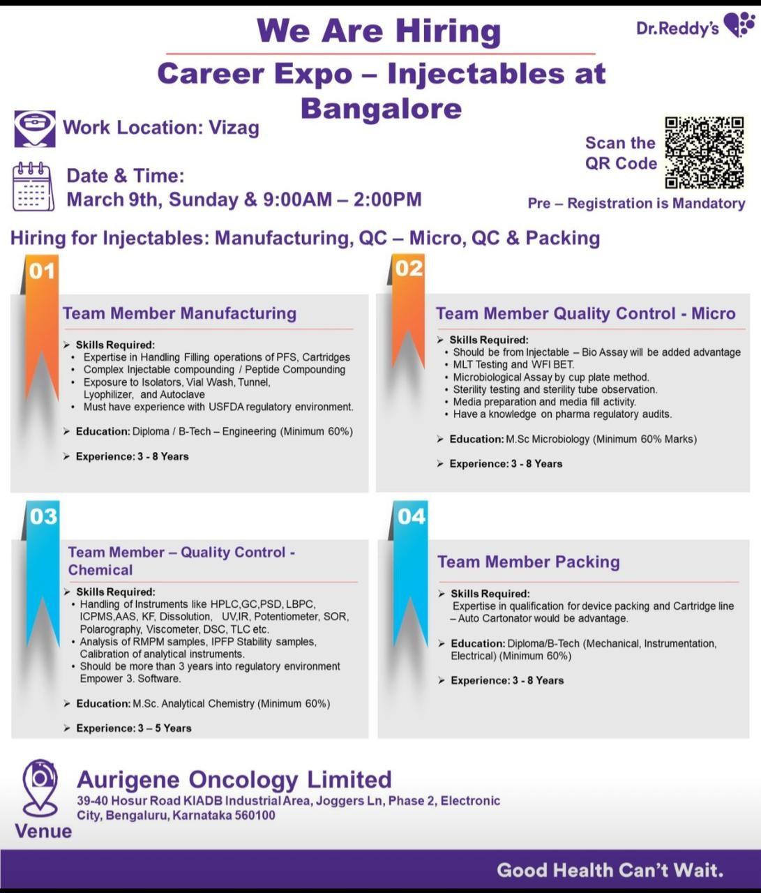 Are you ready to take your career to the next level? Dr Reddy’s is open for Career Expo on March 9th, Sunday, from 9:00 AM to 3:00 PM at our Bangalore location. We are hiring for multiple positions in Manufacturing, Quality Control (Micro & Chemical), and Packing departments.