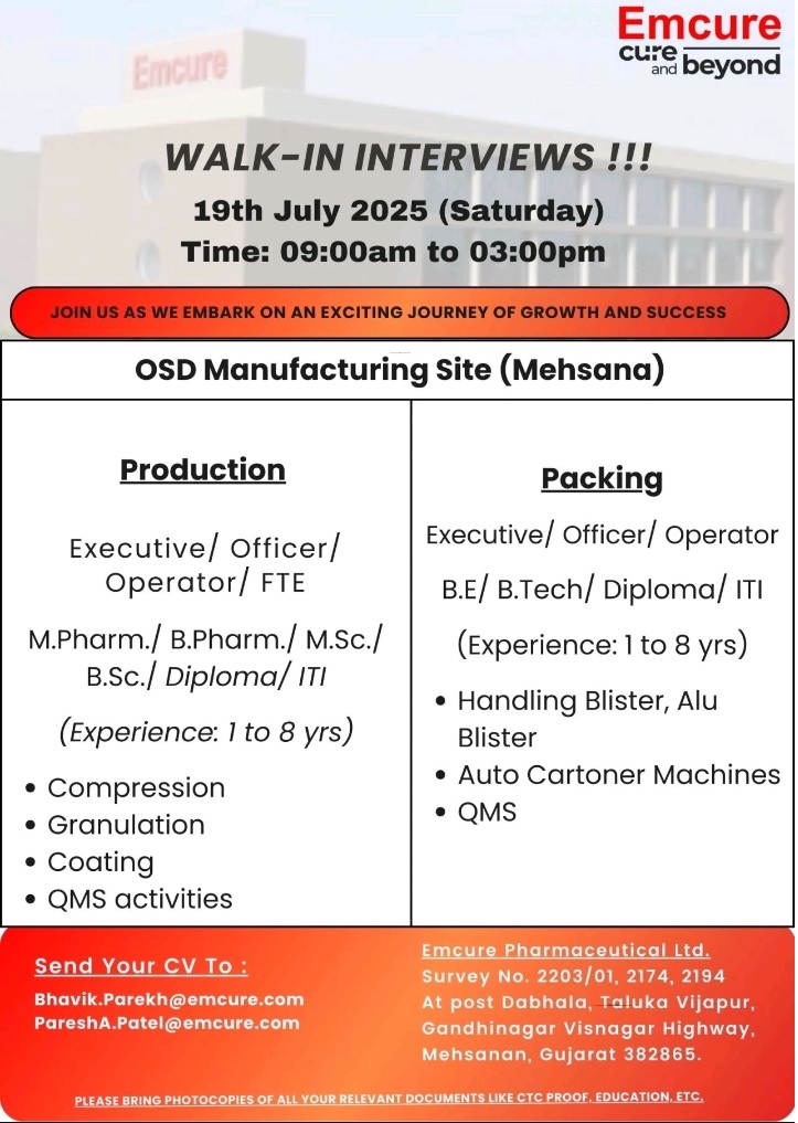 Emcure Pharma- Walk in Interview for Production& Packing 2025 on 19th July 2025@Mahesana Emcure Pharma- Walk in Interview for Production& Packing 2025 on 19th July 2025@Mahesana Post Views: 303 Job Category: Pharma Job Type: Full Time Job Location: Gujarat Apply for this position Full Name *Email *Phone *Cover Letter *Upload CV/Resume *Allowed Type(s): .pdf, .doc, .docxBy using this form you agree with the storage and handling of your data by this website. *