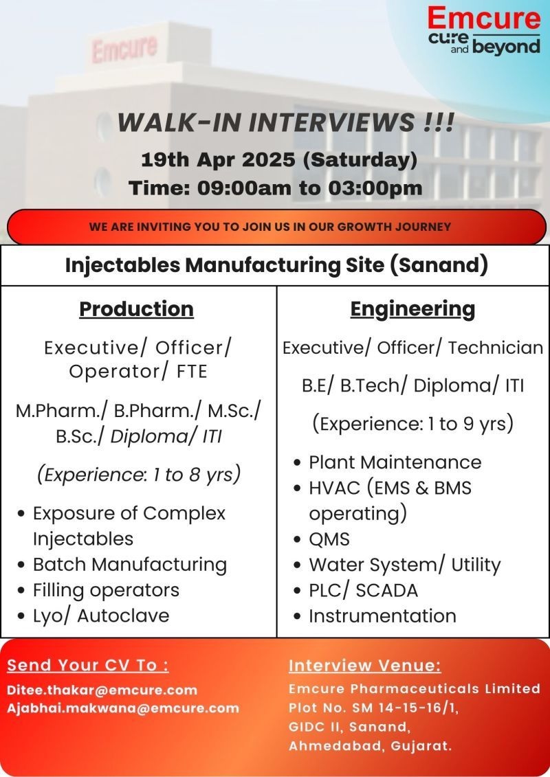 Emcure Pharma -Walk In Interviews For Production & Engineering on 19th April 2025 Emcure Pharma -Walk In Interviews For Production & Engineering on 19th April 2025 Post Views: 876 Job Category: Pharma Job Type: Full Time Job Location: Ahmedabad Apply for this position Full Name *Email *Phone *Cover Letter *Upload CV/Resume *Allowed Type(s): .pdf, .doc, .docxBy using this form you agree with the storage and handling of your data by this website. *