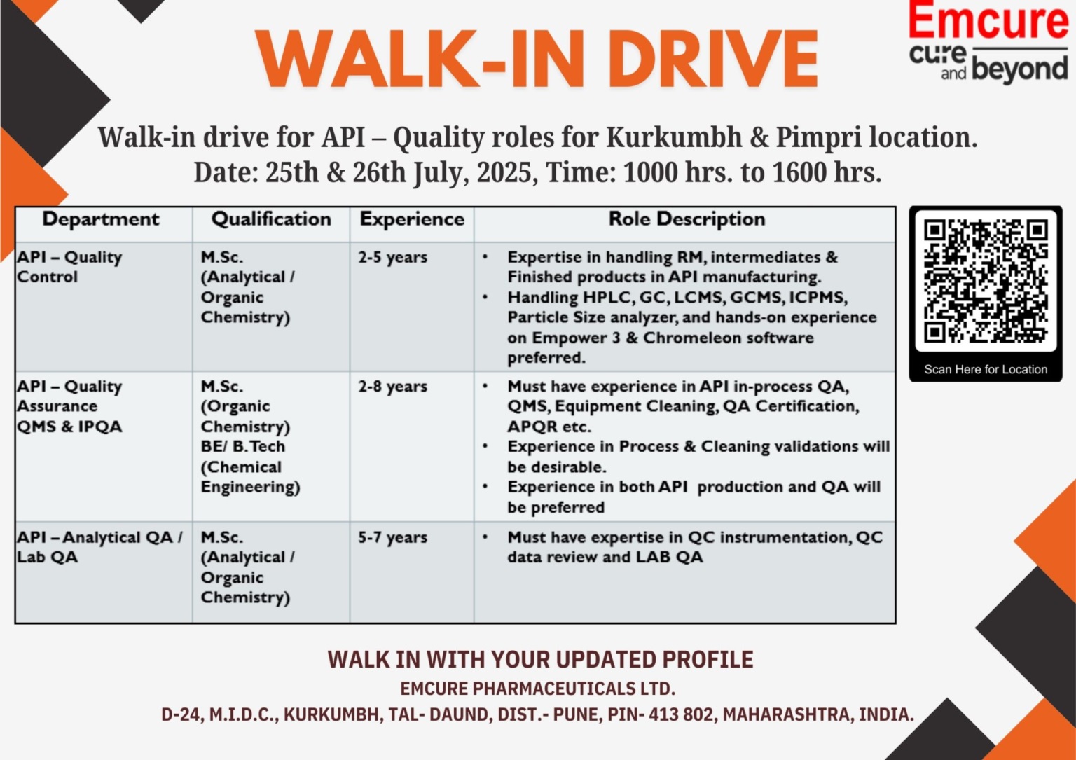 Emcure Pharmaceuticals- Walk-In Drive – API Quality Control & Assurance on 25th-26th July 2025@ Pune