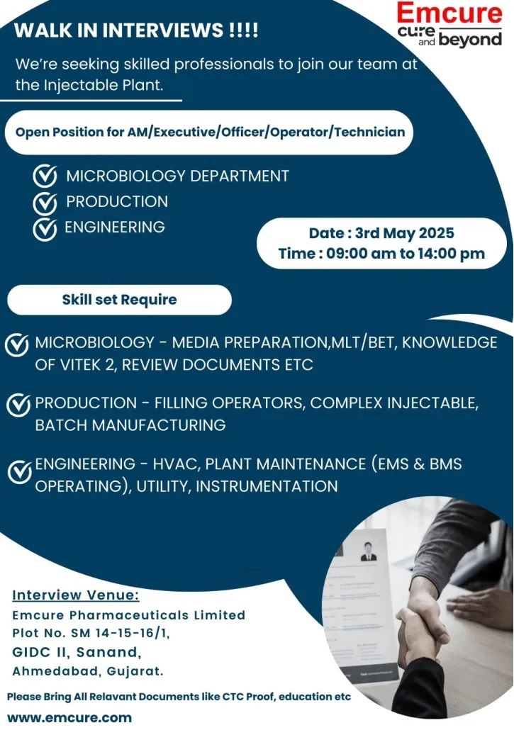 Emcure Pharmaceuticals- Walk-In Interviews Microbiology, Production & Engineering on May 3rd, 2025 Emcure Pharmaceuticals- Walk-In Interviews Microbiology, Production & Engineering on May 3rd, 2025 Post Views: 832 Job Category: Pharma Job Type: Full Time Job Location: Ahmedabad Apply for this position Full Name *Email *Phone *Cover Letter *Upload CV/Resume *Allowed Type(s): .pdf, .doc, .docxBy using this form you agree with the storage and handling of your data by this website. *