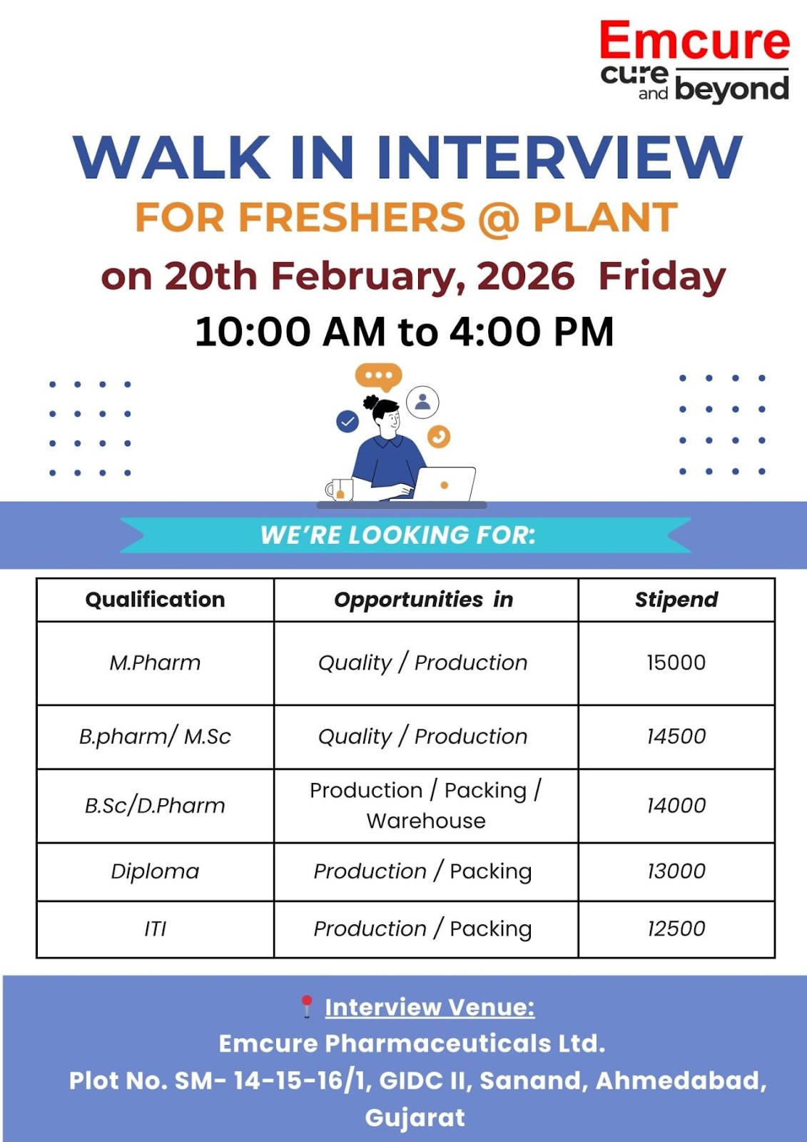 Emcure -Walk-In Interview for Freshers Production, Quality & Packing on 20th February 2026 @ Sanand Ahmedabad Emcure -Walk-In Interview for Freshers Production, Quality & Packing on 20th February 2026 @ Sanand Ahmedabad Post Views: 32 Job Category: Pharma Job Type: Full Time Job Location: Ahmadabad Apply for this position Full Name *Email *Phone *Cover Letter *Upload CV/Resume *Allowed Type(s): .pdf, .doc, .docxBy using this form you agree with the storage and handling of your data by this website. *