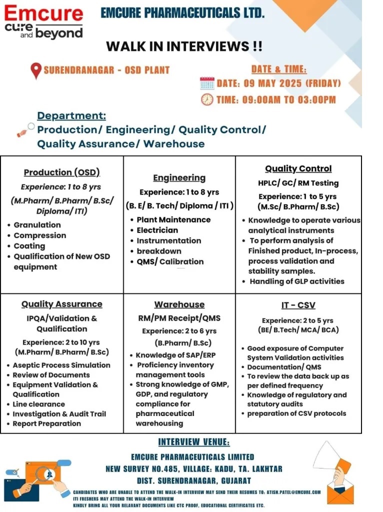 Emcure-Walk-In Interview for OSD Plant Production (OSD)/ QA/ QC/ Engineering/ Warehouse/ IT – CSV on Friday, 09 May 2025