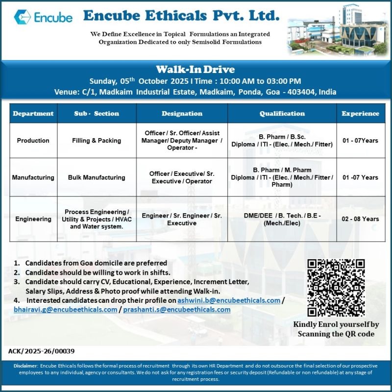 Encube Ethicals- Walk-In Interview For Production, Manufacturing & Engineering on 05th October 2025