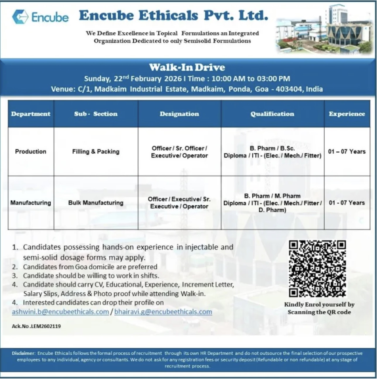 Encube Ethicals- Walk-In Drive for Production & Manufacturing on 22 February 2026 @ Goa Encube Ethicals- Walk-In Drive for Production & Manufacturing on 22 February 2026 @ Goa Post Views: 65 Job Category: Pharma Job Type: Full Time Job Location: goa Apply for this position Full Name *Email *Phone *Cover Letter *Upload CV/Resume *Allowed Type(s): .pdf, .doc, .docxBy using this form you agree with the storage and handling of your data by this website. *
