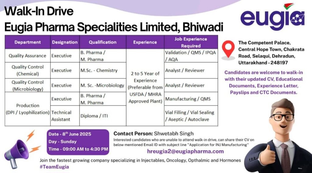 Eugia Pharma Specialities Limited-Walk-In Drive for QA, QC & Production on 8th June 2025