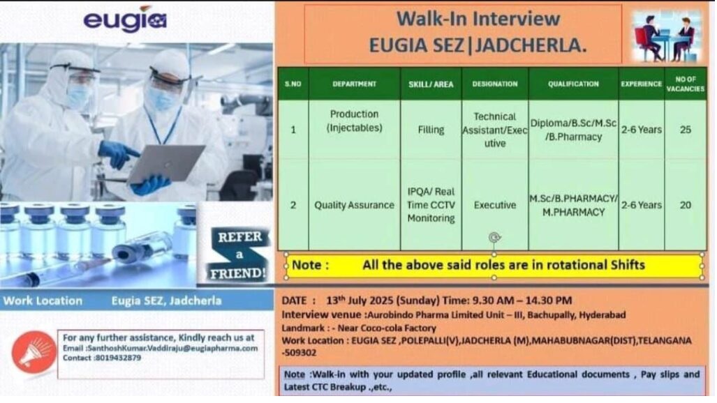 Eugia Pharma- Walk-In Interview for Injectables Production& Quality Assurance on13th July 2025