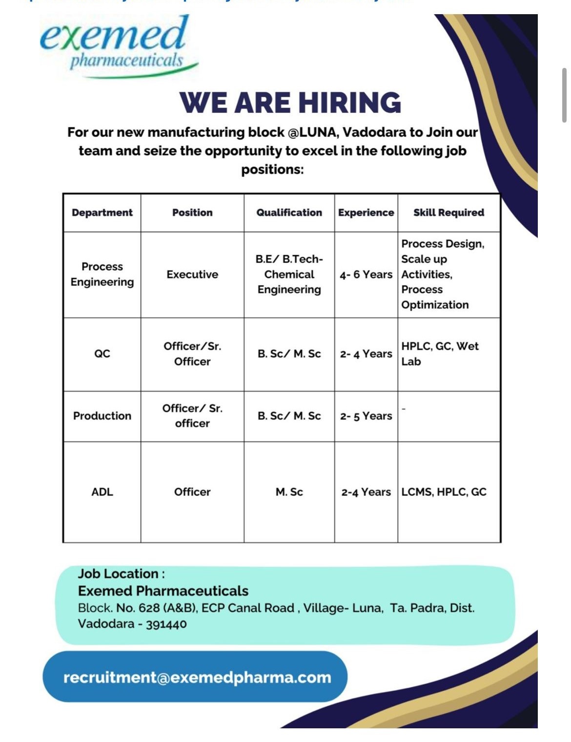 Exemed Pharmaceuticals- Hiring For QC/ADL/Production & Process Engineering Apply Exemed Pharmaceuticals- Hiring For QC/ADL/Production & Process Engineering Apply Post Views: 691 Job Category: Pharma Job Type: Full Time Job Location: Ahmedabad Apply for this position Full Name *Email *Phone *Cover Letter *Upload CV/Resume *Allowed Type(s): .pdf, .doc, .docxBy using this form you agree with the storage and handling of your data by this website. *