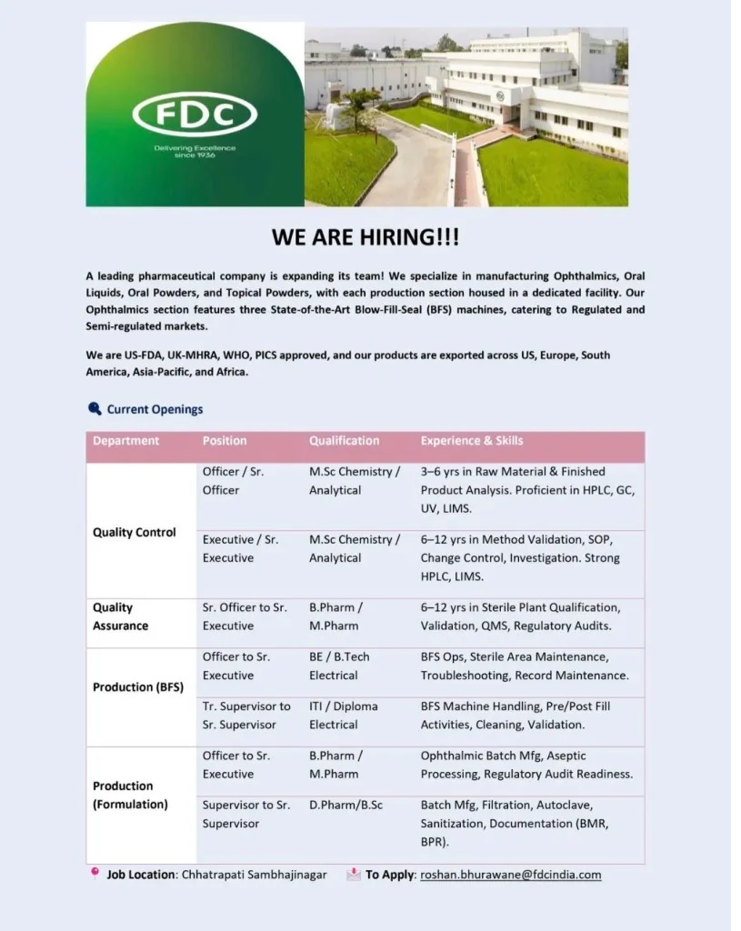 Experience & Skills : Ophthalmic Batch Mfg, Aseptic Processing, Regulatory Audit Readiness.