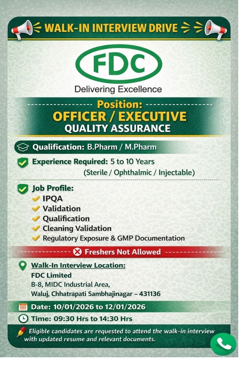 FDC Limited- Walk-In Interview for Officer / Executive Quality Assurance on 10/01/2026 to 12/01/2026 @ Chhatrapati Sambhajinagar FDC Limited- Walk-In Interview for Officer / Executive Quality Assurance on 10/01/2026 to 12/01/2026 @ Chhatrapati Sambhajinagar Post Views: 213 Job Category: Pharma Job Type: Full Time Job Location: Chhatrapati Sambhajinagar Apply for this position Full Name *Email *Phone *Cover Letter *Upload CV/Resume *Allowed Type(s): .pdf, .doc, .docxBy using this form you agree with the storage and handling of your data by this website. *