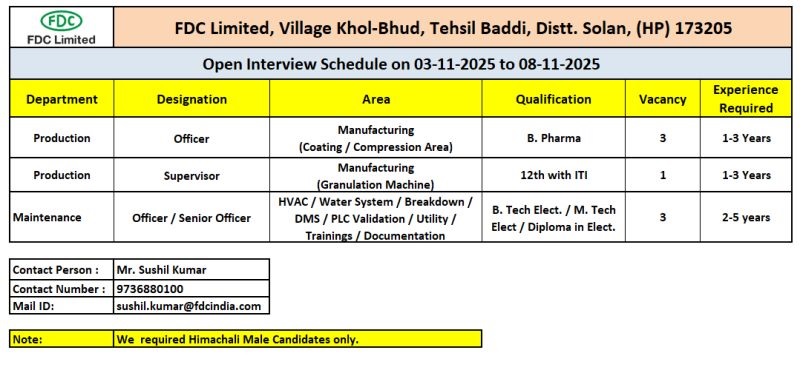 FDC Ltd- Walk-In Interview For Production & Maintenance on 03rd to 08th November 2025