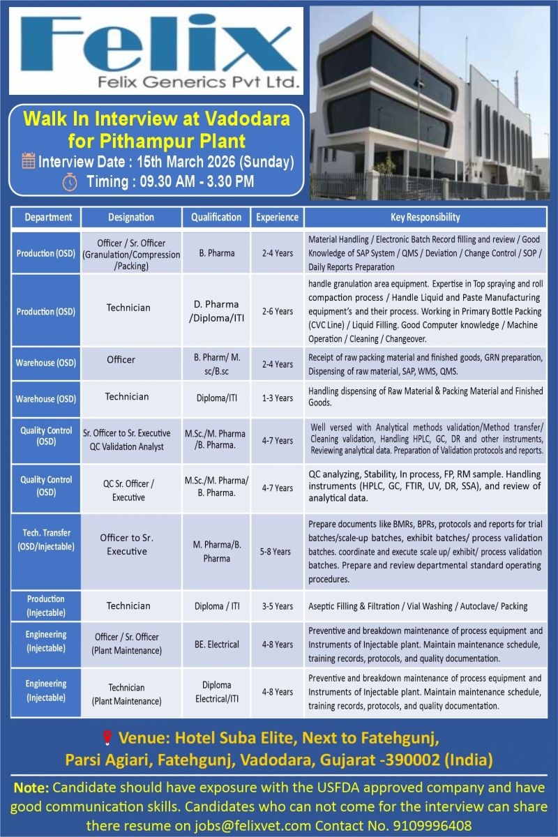 Felix Generics-Walk in Production, Warehouse, Quality Control, Tech. Transfer on 15th March 2026