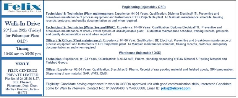 Felix Generics -Walk-In Drive For Warehouse & Engineering (Injectable / OSD) on 20th June 2025