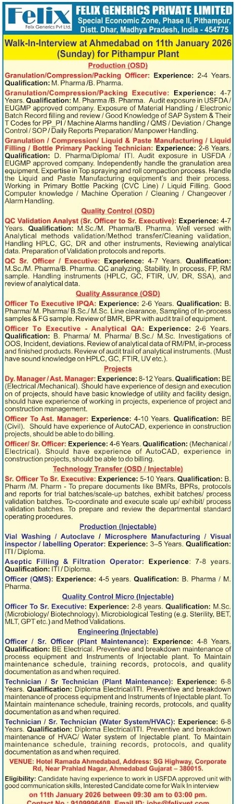 Felix Generics -Walk-In Interview on11 January 2026 @ Pithampur & Ahmedabad