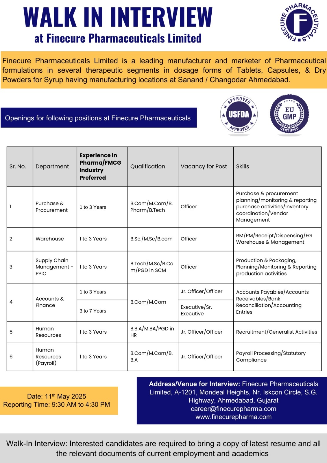 Address/Venue for Interview: Finecure Pharmaceuticals Limited, A-1201, Mondeal Heights, Nr. Iskcon Circle, S.G. Highway, Ahmedabad, Gujarat