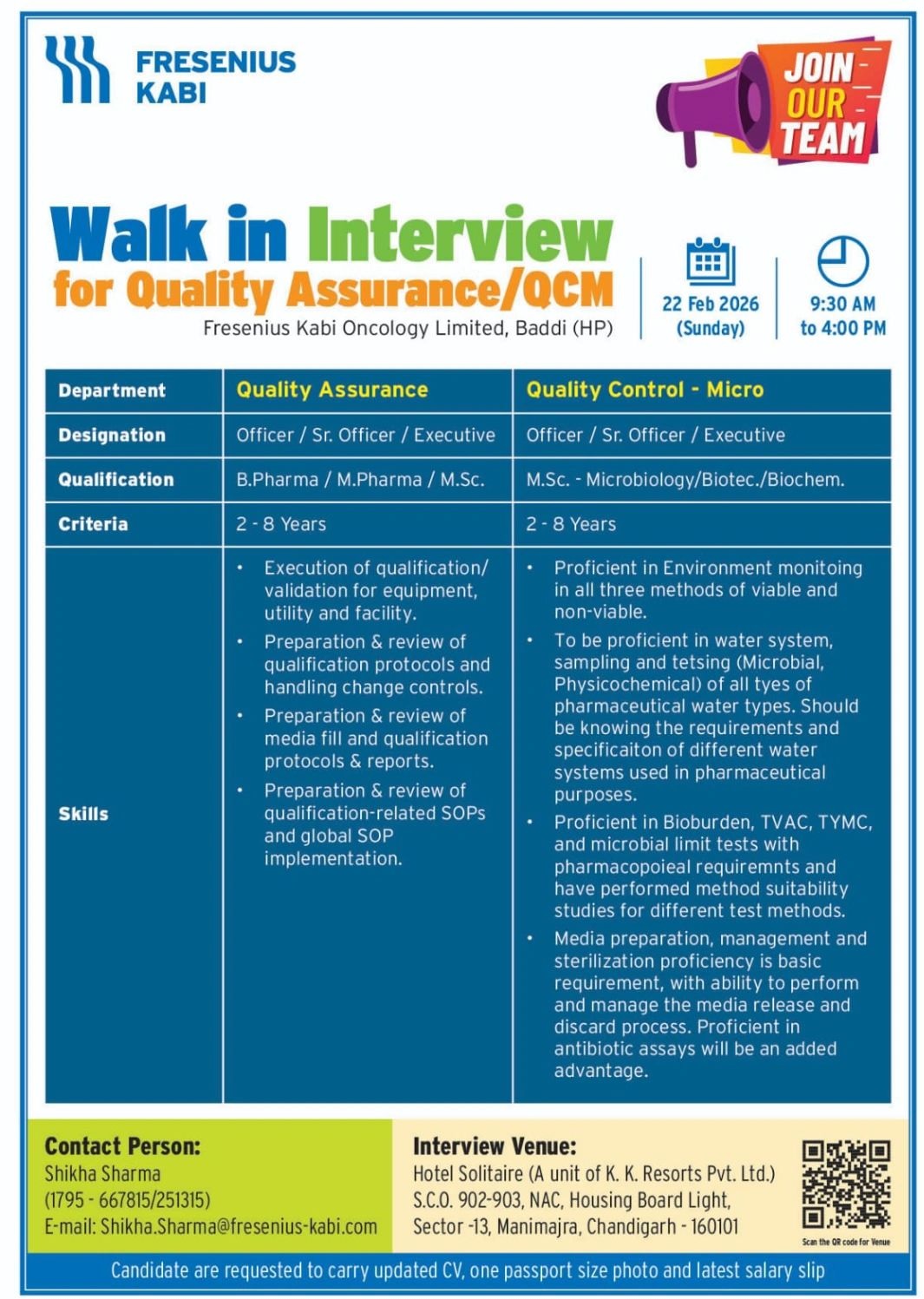 Job Location :Fresenius Kabi Oncology Limited, Baddi (HP)