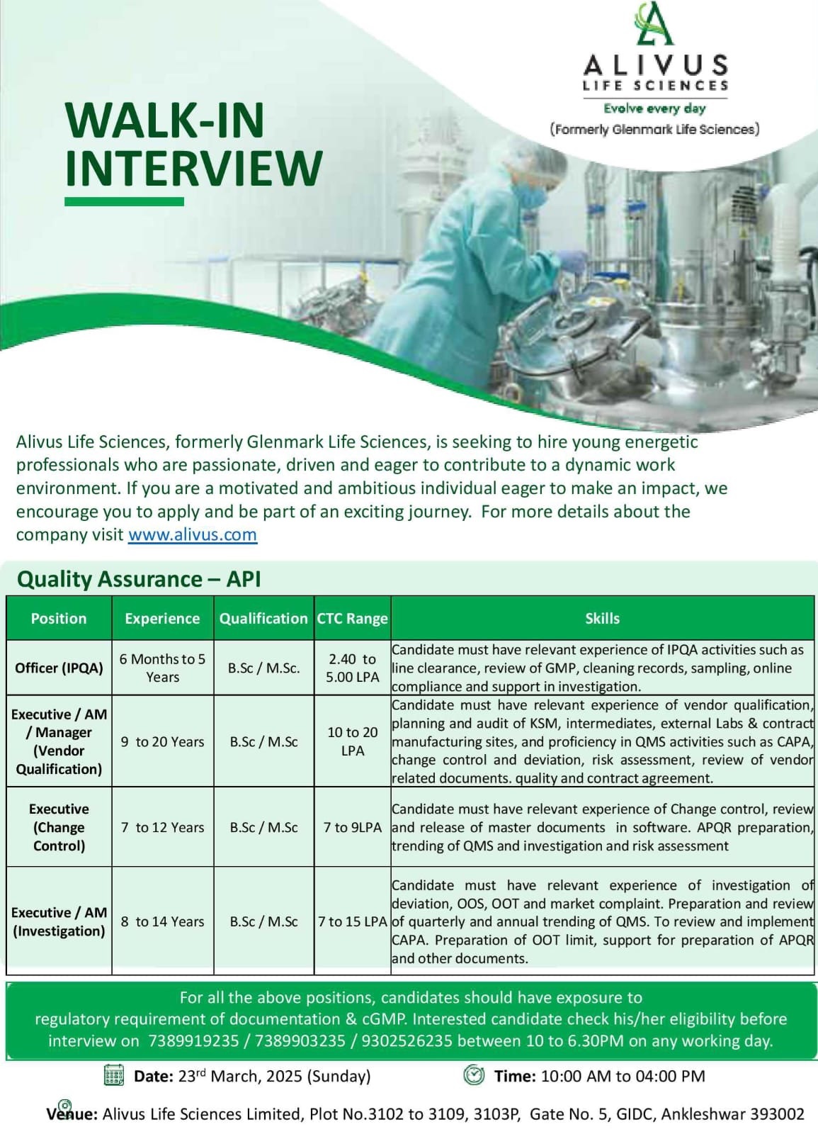 ALIVUS LIFE SCIENCES (Formerly Glenmark Life Sciences)-WALK-IN INTERVIEW on 23rd March, 2025