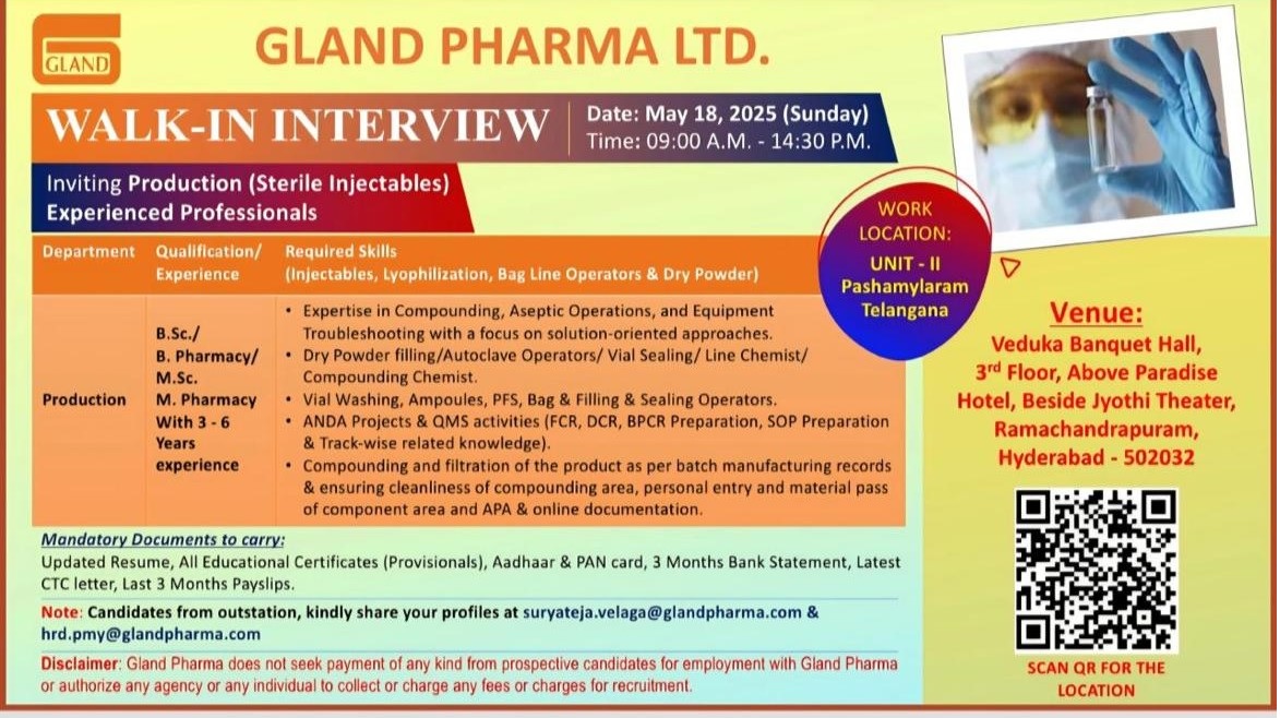 Inviting Production (Injectables) Experienced Professionals