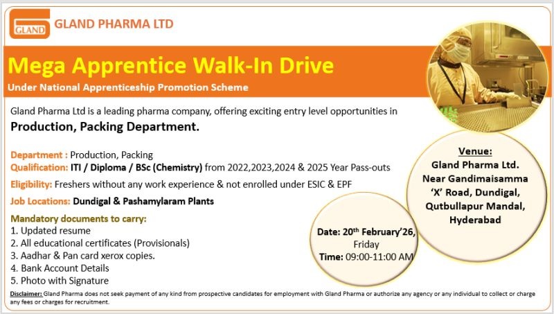 Gland Pharma -Mega Apprentice Walk-In Drive Production & Packing ITI, Diploma, BSc on 20th February 2026