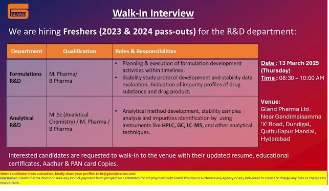 Venue : Gland Pharma Ltd. Near Gandimaisamma ‘X’ Road, Dundigal, Qutbullapur Mandal, Hyderabad