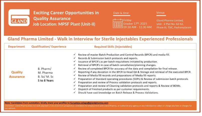 Gland Pharma-Walk in for Quality Assurance – M.Pharm, B.Pharm, MSc on October 17th, 2025