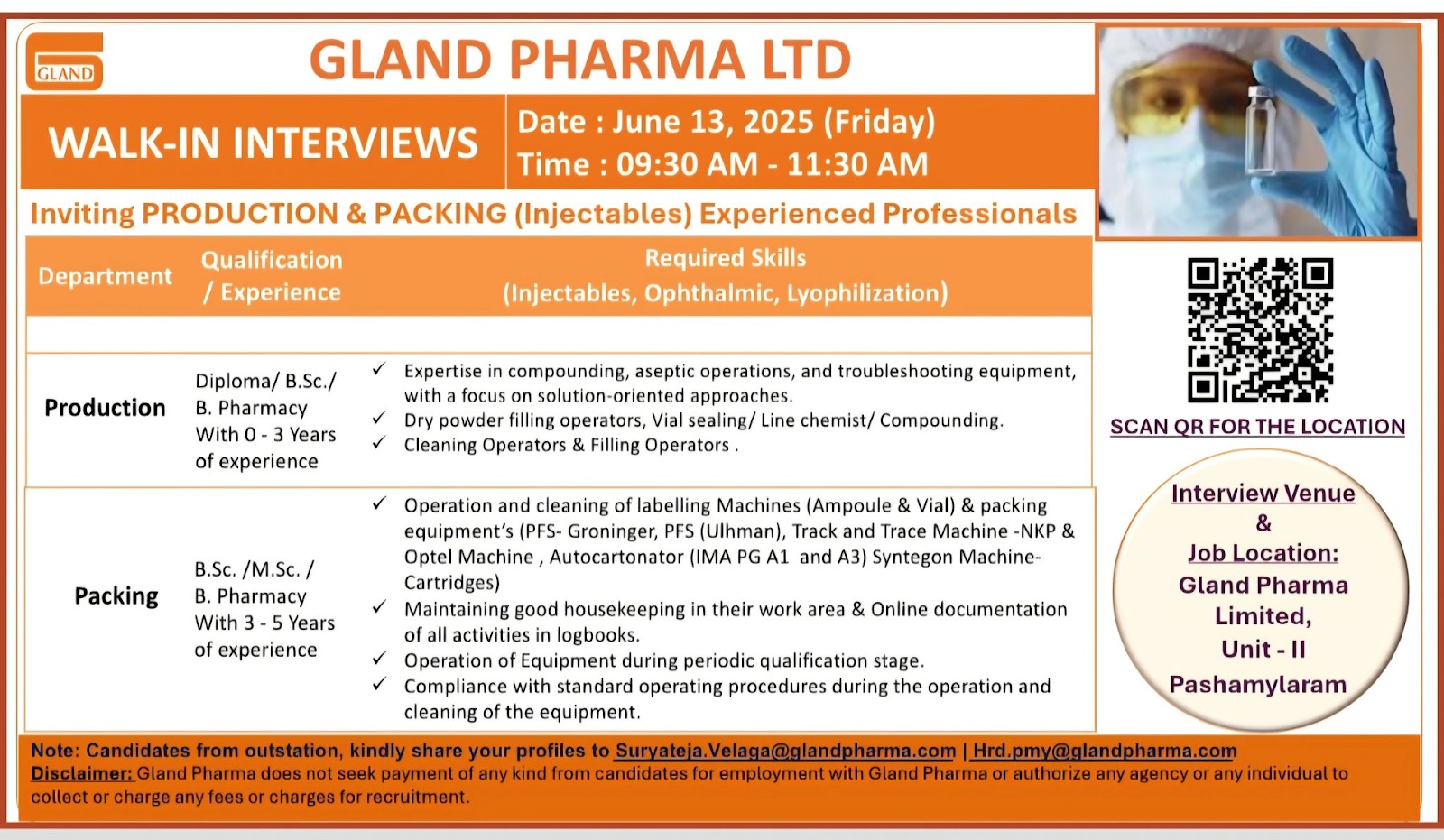 Interview Venue & Job Location : Gland Pharma Limited, Unit – II Pashamylaram