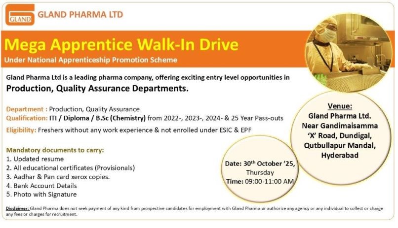 Gland Pharma -Walk-In Drive Interview For Production & Quality Assurance Freshers on October 30, 2025 Gland Pharma -Walk-In Drive Interview For Production & Quality Assurance Freshers on October 30, 2025 Post Views: 312 Job Category: Pharma Job Type: Full Time Job Location: Hyderabad Apply for this position Full Name *Email *Phone *Cover Letter *Upload CV/Resume *Allowed Type(s): .pdf, .doc, .docxBy using this form you agree with the storage and handling of your data by this website. *
