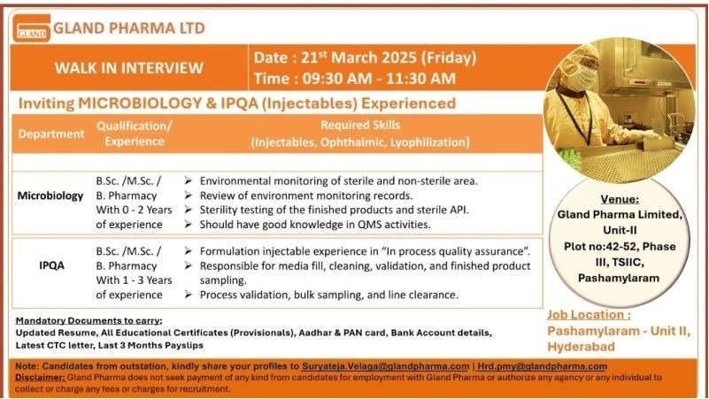Venue : Gland Pharma Limited, Unit – 2 Plot no : 42-52, Phase III, TSIIC, Pashamylaram