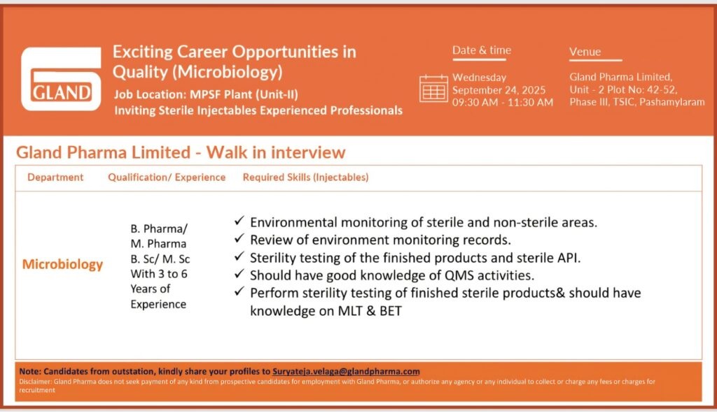 Gland Pharma- Walk-In Interview for Microbiology on September 24, 2025@ Pashamylaram Gland Pharma- Walk-In Interview for Microbiology on September 24, 2025@ Pashamylaram Post Views: 357 Job Category: Pharma Job Type: Full Time Job Location: Pashamylaram Apply for this position Full Name *Email *Phone *Cover Letter *Upload CV/Resume *Allowed Type(s): .pdf, .doc, .docxBy using this form you agree with the storage and handling of your data by this website. *