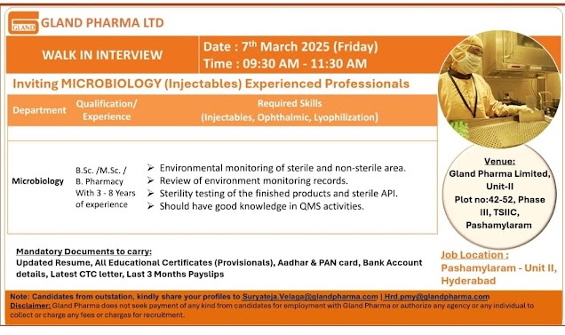 Gland Pharma- Walk In Interview For Microbiology Dept on 7th March 2025