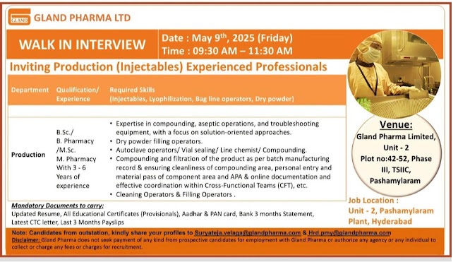 Gland Pharma- Walk In Interview For Production Dept on May 9th, 2025