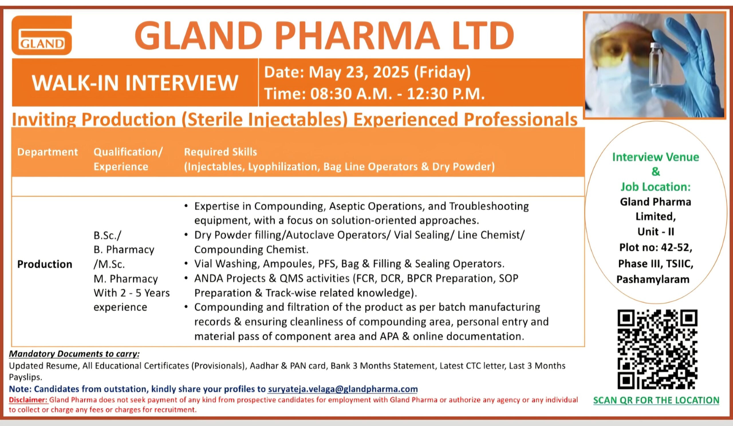 Disclaimer: Gland Pharma does not seek payment of any kind from prospective candidates for employment with Gland Pharma or authorize any agency or any individual SCAN QR FOR THE LOCATION to collect or charge any fees or charges for recruitment.