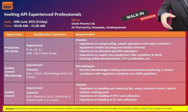 Disclaimer: Gland Pharma does not seek any kind of payment from prospective candidates for employment with Gland Pharma or authorize any agency or any individual to collect or charge any fees or charges for recruitment