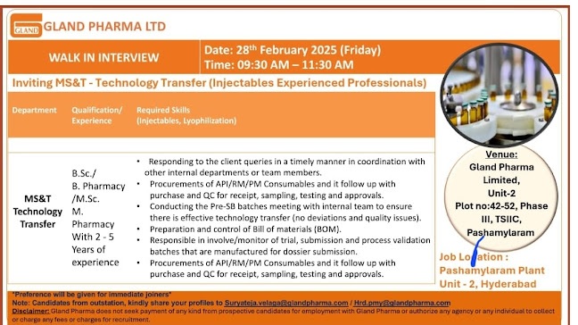 Gland Pharma -Walk In Interview For MS&T Dept on 28th February 2025