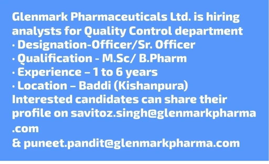 Glenmark Pharmaceuticals Ltd.- Hiring @ Baddi for Quality Control Glenmark Pharmaceuticals Ltd.- Hiring @ Baddi for Quality Control Post Views: 1,194 Job Category: Pharma Job Type: Full Time Job Location: Baddi Apply for this position Full Name *Email *Phone *Cover Letter *Upload CV/Resume *Allowed Type(s): .pdf, .doc, .docxBy using this form you agree with the storage and handling of your data by this website. *