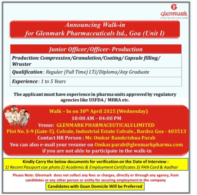 Glenmark- Walk-in for unior Officer/Officer- Production on 30th April 2025