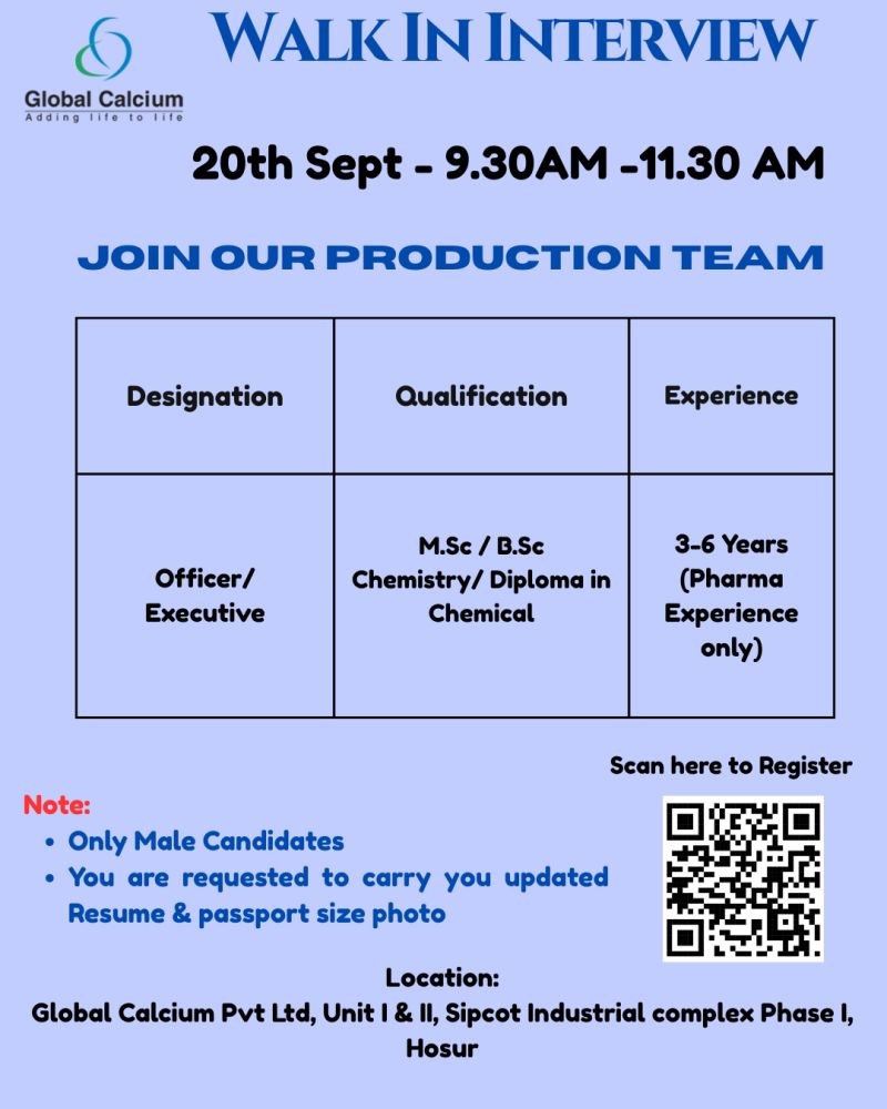 Global Calcium -Walk in For Officer/Executive Positions on 20th September 2025 Global Calcium -Walk in For Officer/Executive Positions on 20th September 2025 Post Views: 369 Job Category: Pharma Job Type: Full Time Job Location: Hosur Apply for this position Full Name *Email *Phone *Cover Letter *Upload CV/Resume *Allowed Type(s): .pdf, .doc, .docxBy using this form you agree with the storage and handling of your data by this website. *
